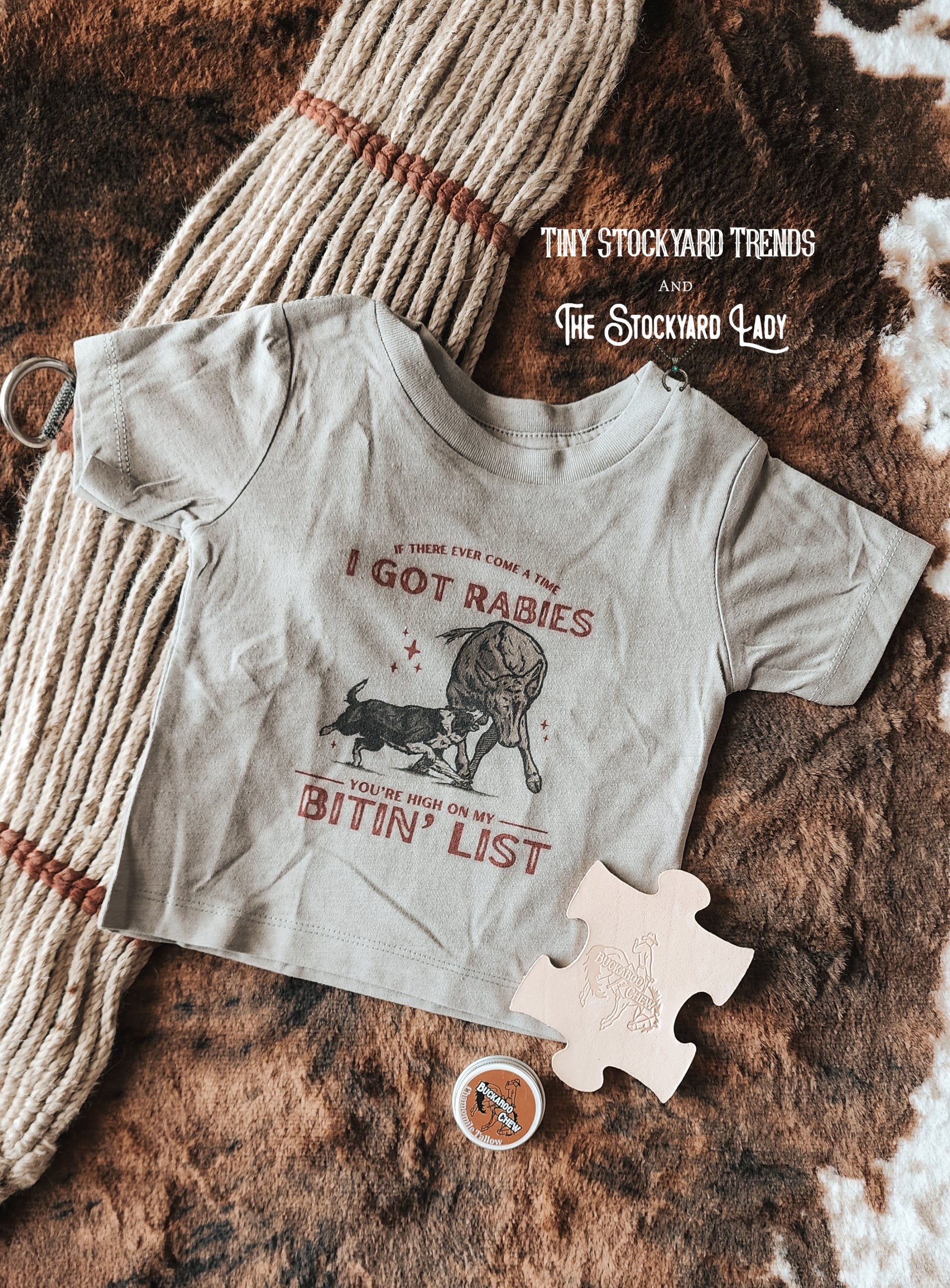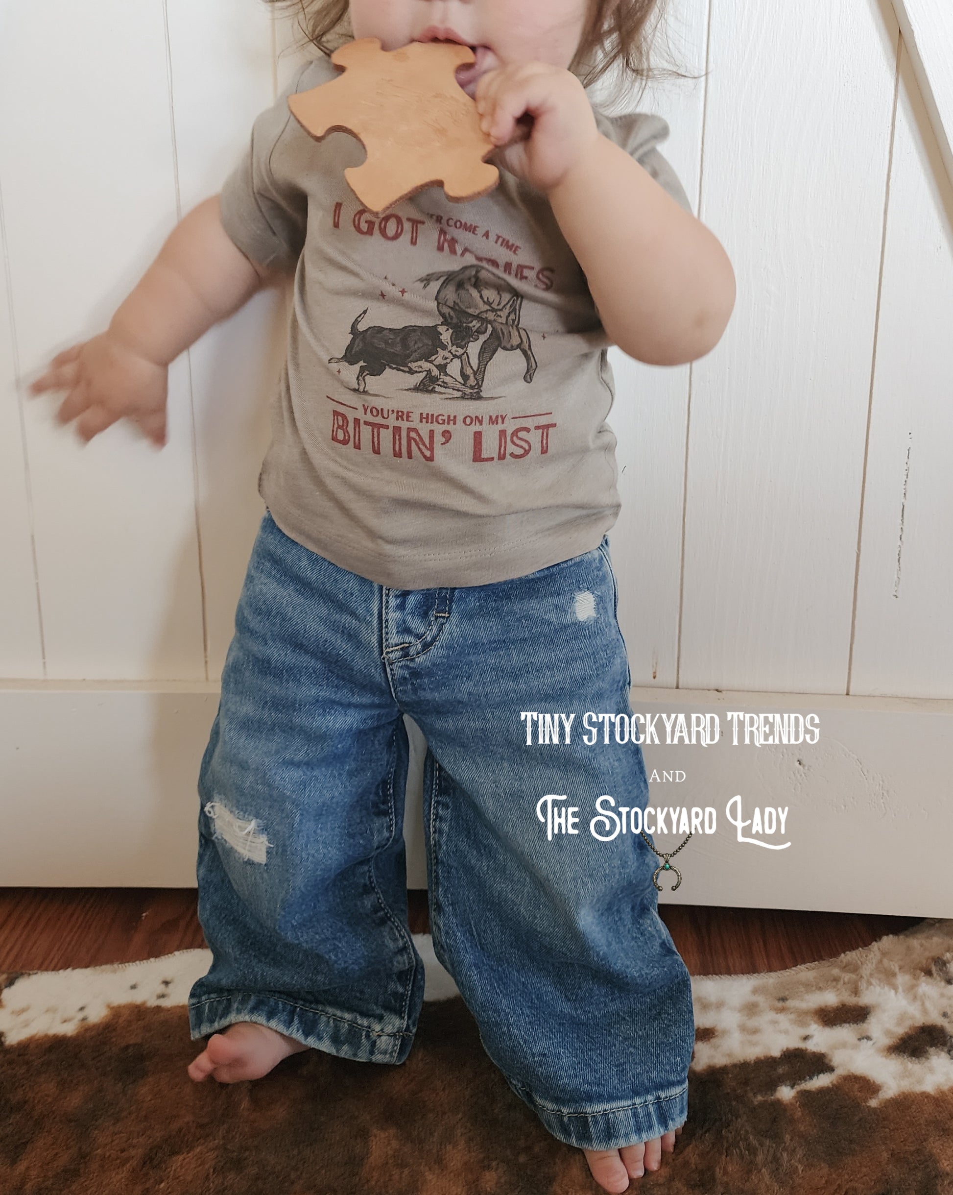 Hassie is a size 12-18m usually. She is wearing a 6-12m in this tee.