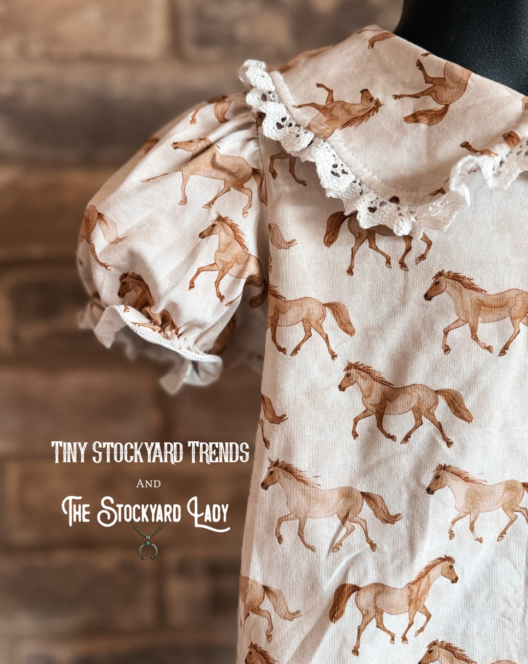 This easily became a personal favorite! The Peter Pan collar with lace detail, the puff sleeve, the horses, we’re obsessed with it all.