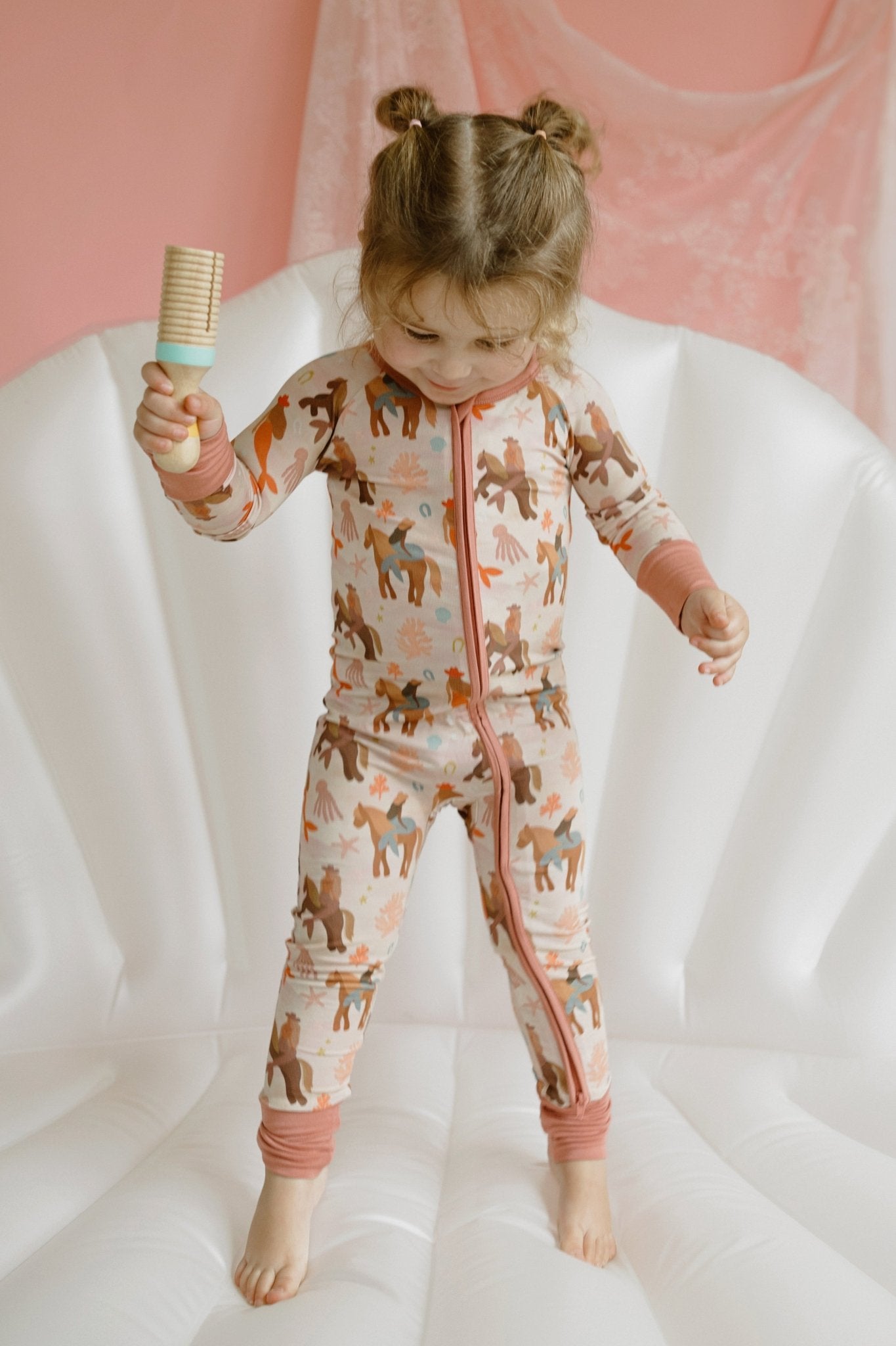 Our Mermaid Cowgirl Convertible Bamboo Zip Pajama Romper – Baby & Toddler Pajama Rompers is where wild west meets sea breeze. Featuring our playful mermaids-in-cowgirl-hats print, this soft and stretchy one-piece is made from a premium blend of 95% viscose from bamboo and 5% spandex — breathable, gentle on sensitive skin, and made for sleep or play.